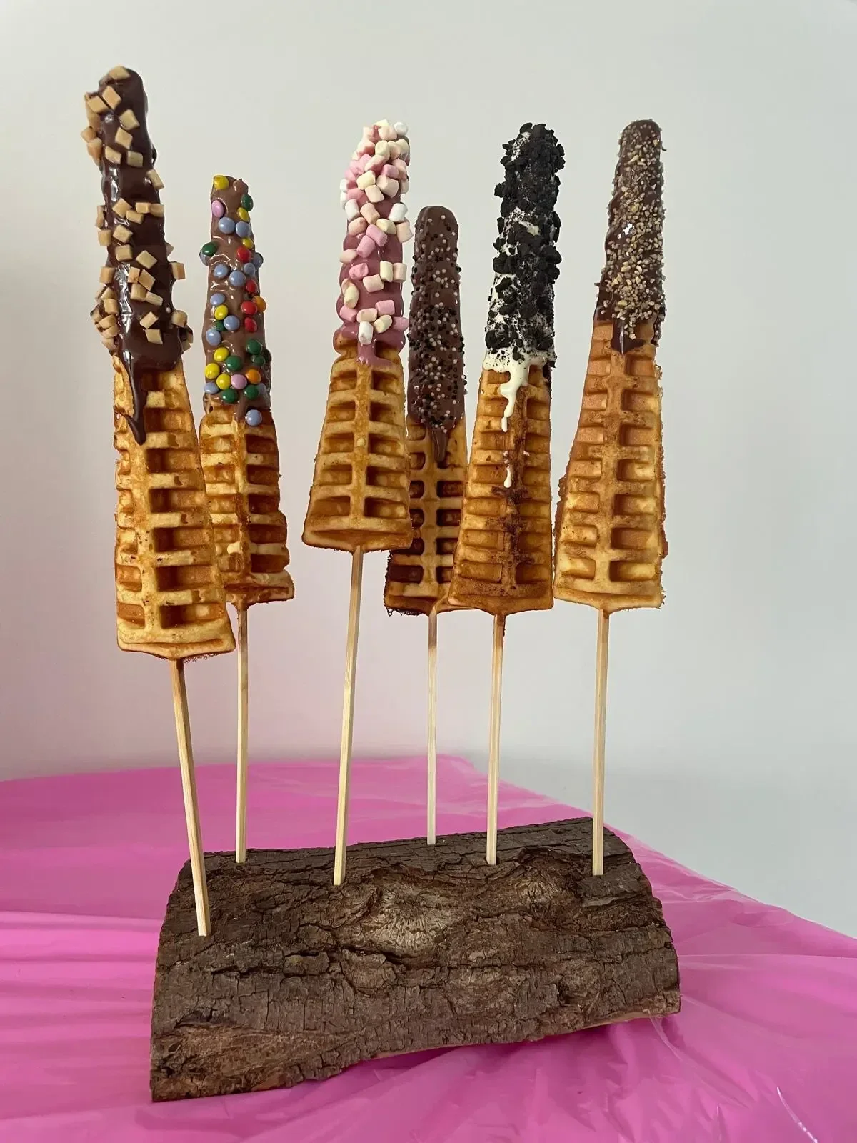 Deze wafel kan in verschillende kleuren chocolade gedipt worden en eventueel daarop versiersels.